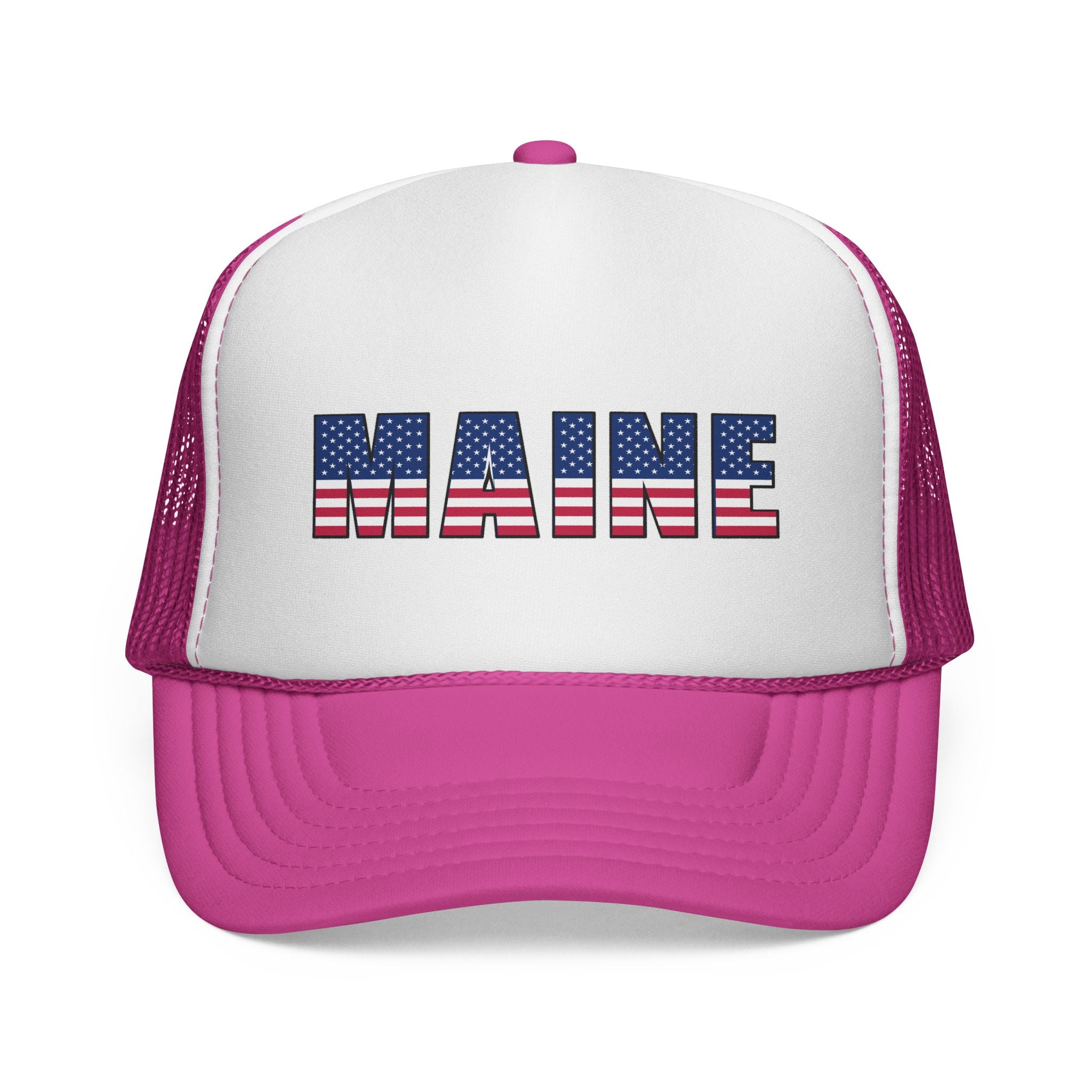 Chunky foam front and airy mesh back come together in a trucker hat that carries a Maine stars-and-stripes vibe—bright, a little rugged, and unapologetically colorful. Wear it on a salt-sprayed morning drive, at a backyard clambake, or while wandering coastal towns. The structured front holds the printed star-and-stripe motif crisp and sharp, while the ventilated nylon mesh keeps your head cool through sun and sea breezes. The adjustable snap lets you dial in a comfortable fit, and color-matched details (undervisor, sweatband, braid and closure) make each option feel thoughtfully finished. This is a hat that settles into summer rituals: fishing docks, roadside seafood shacks, and slow sunset walks, carrying a bit of Maine with every step.